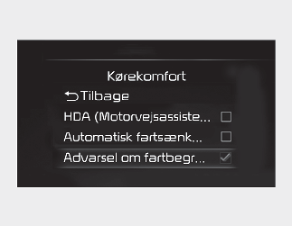 Hvis der vælges Advarsel om hastighedsgrænse, informerer Intelligent advarsel om hastighedsgrænse føreren om hastighedsgrænsen. Funktionen advarer også føreren, hvis bilen kører hurtigere end fartbegrænsningen tillader.