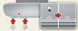 If the indicator (4) or (6) does not turn to green, it indicates that the last status of garage door was not received properly. The HomeLink mirror tries to receive the last known status of the garage door for a few seconds.