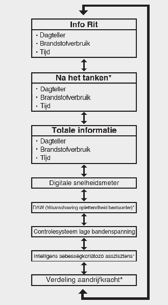 Het display toont de ritafstand, het gemiddelde brandstofverbruik en de totale rijtijd voor iedere cyclus tussen het in- en uitschakelen van de motor.