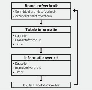 Het gemiddelde brandstofverbruik wordt berekend aan de hand van de totale rijafstand en het brandstofverbruik vanaf het moment dat het gemiddelde brandstofverbruik voor het laatst werd gereset.
