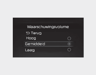 Zelfs als 'Off' ('Uit') wordt geselecteerd, wordt het waarschuwingsvolume van het systeem echter niet helemaal uitgeschakeld, maar klinkt het volume zoals bij de instelling 'Low’ ('Laag').