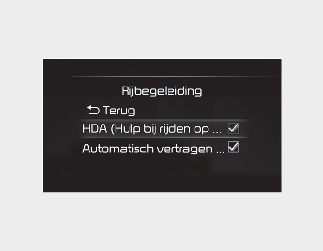 Terwijl de toets ENGINE START/STOP (Motor starten/stoppen) in stand ON staat, selecteert u 'Driver Assistance → Driving Assist → Highway Auto Speed Change ' ('Bestuurdershulp → Rijassistentie → Snelheid automatisch veranderen op de snelweg') in het menu Settings (instellingen) om Navigation-based Smart Cruise Control in te schakelen en heft u de selectie op om de functie uit te schakelen.
