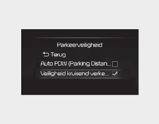 Terwijl de toets ENGINE START/STOP (motor starten/stoppen) op AAN staat, selecteert u 'Driver Assistance (Bestuurdershulp) → Parking Safety (Parkeerveiligheid) → Rear Cross-Traffic Safety (Veiligheid kruisend verkeer achterkant)' in het menu Settings (instellingen) om de Rear Cross-Traffic Collision-Avoidance Assist (ondersteuning botsingsvermijding achterzijde) in te schakelen en heft u de selectie op om de functie uit te schakelen.