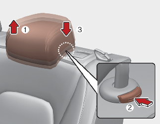 헤드레스트를 높이려면 헤드레스트를 잡고 잠기는 위치까지 위로 당겨 올리십시오(1). 헤드레스트를 낮추려면, 잠금해제 버튼을 누른 상태에서(2) 헤드레스트를 위에서 누르십시오(3).