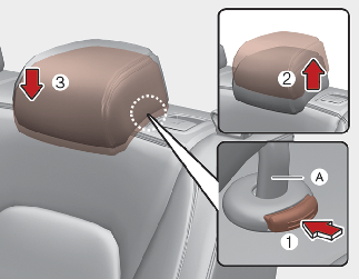 장착 시는 헤드레스트 폴가이드(A)를 홈에 끼운 후(3), 잠금해제 버튼(1)을 누른 상태에서 내려 적당한 위치로 조절하십시오.
