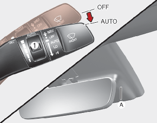 차내 중앙 앞 유리 상단에 설치된 센서(A)에서 비의 양을 감지하여 비의 양이 많아지면 와이퍼 작동속도가 빨라지고, 비의 양이 적어지면 느려지다가 비가 멈추면 작동도 멈춥니다. 와이퍼 속도조절을 변경하고자 할 때는 속도조절노브(1)를 돌려 조절할 수 있습니다. 위쪽으로 돌리면 속도가 빨라지고 아래쪽으로 돌리면 속도가 느려집니다.