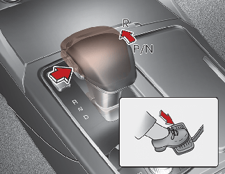 브레이크 페달을 밟고 변속레버 앞쪽에 위치한 「P RELEASE」버튼을 누르면 변속레버가 「N」(중립) 상태로 변경됩니다.