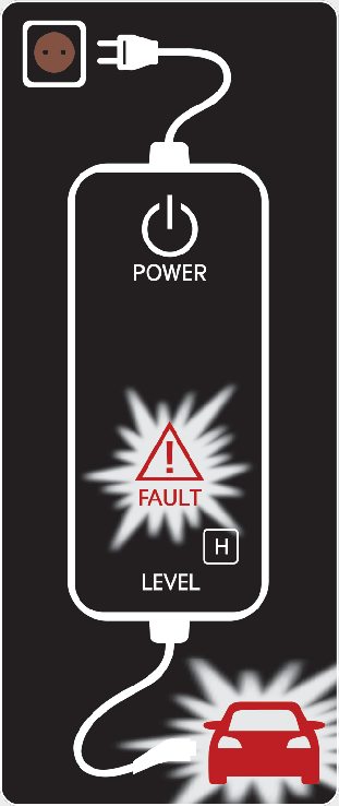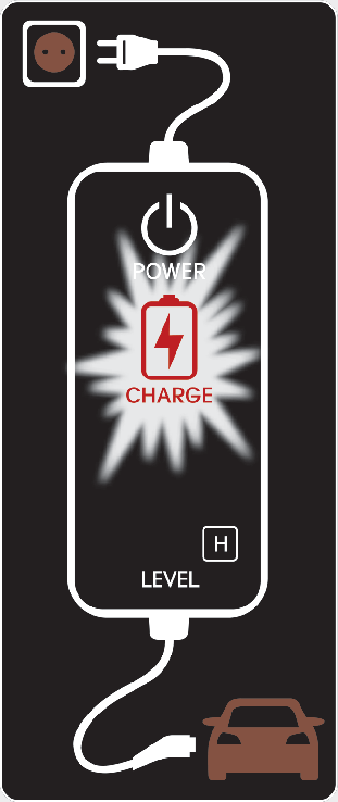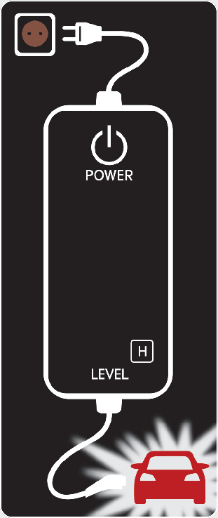 Ladestrømmen endres når knappen (1) trykkes i mindre enn 1 sekund med laderen tilkoblet et strømuttak, men ikke bilen. ![]() |