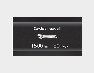 Hvis den gjenværende kjørelengden eller tiden når 1 500 km (900 mi.) eller 30 dager, vises "Service in" (Service om) i noen sekunder hver gang du setter tenningsbryteren eller ENGINE START/STOP (start/stopp-knappen) til ON.