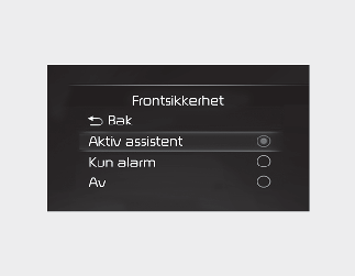Med ENGINE START/STOP (start/stopp-knappen) i ON, velg eller fravelg 'Førerassistanse → Frontsikkerhet' fra menyen Innstillinger for å velge hvorvidt hver funksjon skal brukes.
