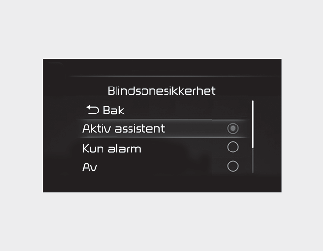 Med ENGINE START/STOP (start/stopp-knappen) i ON, velg eller fravelg 'Førerassistanse →Blindsonesikkerhet' fra menyen Innstillinger for å velge hvorvidt hver funksjon skal brukes.