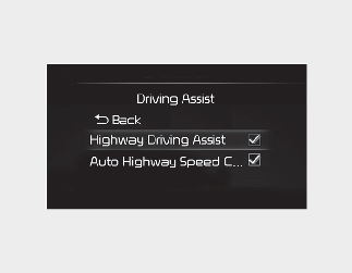 Med ENGINE START/STOP (start/stopp-knappen) i ON (PÅ), velg 'Førerassistanse → Kjøreassistanse → Automatisk endring av farten på motorvei' fra menyen Innstillinger for å slå på og av navigasjonsbasert smart hastighetskontroll.