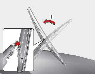 Heben Sie dann den Clip (1) des Wischerblatts nach oben. Anschließend ziehen Sie das Wischerblatt (2) heraus und entfernen es.