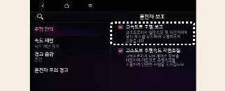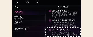 시동 'ON' 상태에서 인포테인먼트 시스템의 설정 → 차량 → 운전자 보조 → 주행 편의를 차례로 선택하십시오. 각 기능의 사용 여부를 설정할 수 있습니다.