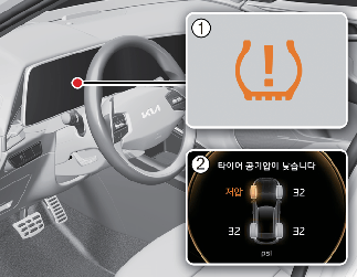 각 타이어 및 휠에는 타이어 공기압 감지 센서가 장착되어 있습니다. 타이어 공기압 감지 센서가 장착된 타이어로 교체 후 몇 분간 주행을 하면 경고등은 꺼집니다. 계속해서 경고등이 꺼지지 않으면 자사 직영 서비스센터 또는 서비스협력사에 의뢰하십시오.