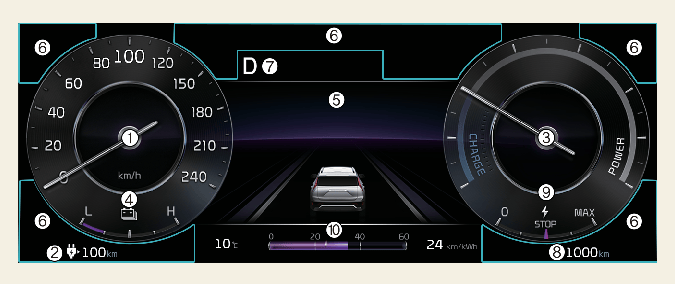 모터 소비 전력 및 회생 제동 브레이크 전기 에너지의 충전, 방전 상태를 알려줍니다.