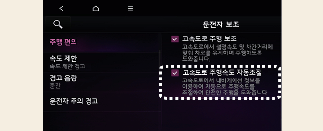 시동 'ON' 상태에서 인포테인먼트 시스템의 설정 → 차량 → 운전자 보조 → 주행 편의 → 고속도로 주행속도 자동 조절을 차례로 선택하십시오. 내비게이션 기반 스마트 크루즈 컨트롤이 켜집니다.