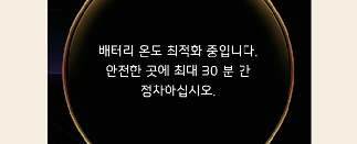 겨울철 배터리 온도가 매우 낮을 경우 정상적인 주행을 위해 배터리 온도 최적화를 수행합니다. 배터리 온도 및 충전 상태에 따라 배터리 온도 최적화 수행 시간은 달라질 수 있습니다.