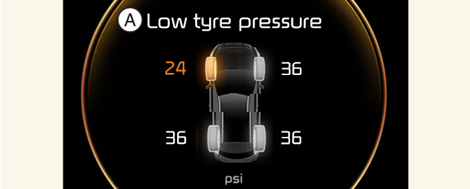 Kad se pojave indikatori upozorenja u sustavu za praćenje tlaka guma i kad se poruka upozorenja prikaže na LCD prikazu upravljačke ploče, jedna ili više od vaših guma je značajno izgubila na tlaku. Oznaka položaja niskog tlaka u gumama će ukazati koja je guma značajno izgubila na tlaku tako što će se prikazati odgovarajuće poziciono svjetlo