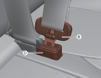 Puxe a lingueta (B) e introduza-a na extremidade aberta da fivela (D) até se ouvir um nítido "clique", indicando que o trinco está trancado. Certifique-se de que o cinto de segurança não fica torcido.