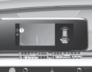 Ao tocar no ícone (1), a vista superior é apresentada no ecrã e mostra a distância do veículo que está atrás do seu veículo durante o estacionamento.