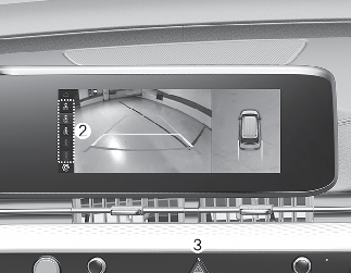 Quando um dos botões do sistema de infotainment (3) é premido sem que a mudança esteja na posição R (Marcha-atrás), o Monitor de visão circundante desliga-se.