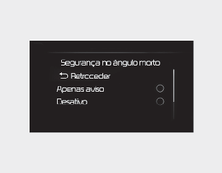 Com o motor a trabalhar, selecione "Driver Assistance (Assist. ao condutor) → Warning volume (Volume do aviso)" no menu Settings (Definições) para alterar o volume do aviso para a Assistência à prevenção de colisão em ângulos mortos.