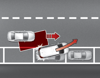 Ao conduzir em marcha em frente, se a função considerar que existe risco de colisão com um veículo em aproximação no ângulo morto, a função ajudará a evitar a colisão ao acionar o travão.