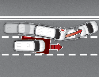 Ao mudar de faixa, detetando a faixa de rodagem em frente, se a função considerar que existe risco de colisão com um veículo em aproximação no ângulo morto, a função ajuda a evitar a colisão ao acionar o travão.