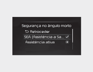 Com o motor a trabalhar, selecione "Driver Assistance (Assist. ao condutor) → Blind-Spot Safety (Segurança no ângulo morto) → Safe Exit Assist (SEA) (ou SEA [Safe Exit Assist] – (Assistência à saída com segurança)" no menu Settings (Definições) para ativar o sistema de assistência à saída com segurança e desmarque para desativar a função.