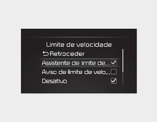 Com o veículo a trabalhar, selecione ou desmarque "Driver Assistance (Assistência ao condutor) → Speed Limit (Limite de velocidade)" no menu Settings (Definições) para definir se pretende ou não utilizar cada função.
