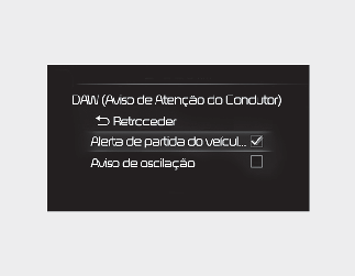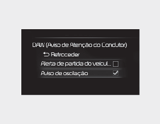 Com o motor a trabalhar, selecione ou desmarque "Driver Assistance (Assist. ao condutor) → Driver Attention Warning (ou DAW [Driver Attention Warning]) (Aviso de Atenção do Condutor)" no menu Settings (Definições) para definir se pretende ou não utilizar cada função.