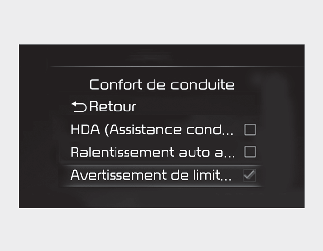 Si "Avertissement de limite de vitesse" est sélectionné, l’avertissement de limite de vitesse intelligent informe le conducteur des limitations de vitesse. De plus, la fonction avertit le conducteur lorsque le véhicule dépasse la limite de vitesse.