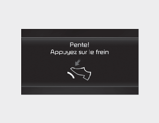 Ce message d'avertissement s'affiche quand le véhicule roule lentement dans une côte et que le véhicule détecte que la pédale de frein n'est pas enfoncée.