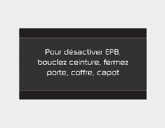 Si vous essayez de démarrer en appuyant sur la pédale d'accélérateur avec l'EPB appliqué, mais qu'il ne se désactive pas automatiquement, un signal retentit une fois et un message s'affiche.