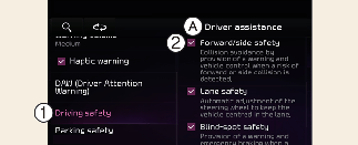 Föraren kan övervaka På/av (on/off)-status för Forward Collision-Avoidance Assist från menyn Inställningar. Om lampan Säkerhet
