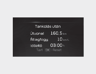 Ha a Tankolás óta mért adatok megjelenítése után több, mint 1 másodpercig nyomva tartja az „OK” gombot, az információk lenullázódnak.