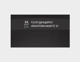 Az ESC rendszer mind a tapadásvezérlés, mind a fékvezérlés funkciójának kikapcsolásához nyomja le 3 másodpercnél hosszabb ideig az ESC OFF (ESC KI) gombot (ESC OFF ) Ekkor világítani kezd az ESC OFF (ESC KI) ellenőrző lámpa (ESC OFF) és megszólal az ESC OFF (ESC KI) figyelmeztető hangjelzés. Ebben az állapotban a jármű menetstabilizálási funkciója már nem működik.
