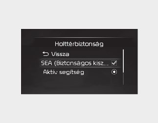 Az ENGINE START/STOP (Motor be/ki) gomb ON állásában válassza a 'Vezetéssegítő rendszer → Holttér-biztonság → Biztonságos kiszállás asszisztens' elemet a Beállítások menüben a Biztonságos kiszállás segéd bekapcsolásához, és törölje a kijelölést a funkció kikapcsolásához.