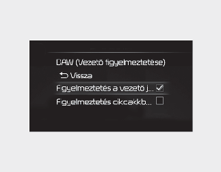 Az ENGINE START/STOP (Motor be/ki) gomb ON állásában válassza a 'Vezetéssegítő rendszer Vezető-figyelmeztetés' elemet a Beállítások menüből a funkció használatához, vagy törölje a kiválasztást a funkció kikapcsolásához.