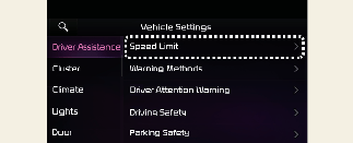 Nopeusrajoitusvaroitus: Jos älykäs nopeusrajoitusavustin on valittuna, se tiedottaa kuljettajalle nopeusrajoituksesta ja muista liikennemerkeistä. Lisäksi älykäs nopeusrajoitusavustin varoittaa kuljettajaa, kun auton nopeus ylittää nopeusrajoituksen.