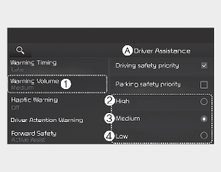 Con el vehículo encendido, seleccione Ajustes → Asistencia al conductor → Volumen de advertencia → Ajustes → Vehículo →Volumen de avisoen la pantalla del sistema de infoentretenimiento para cambiar el volumen de advertencia para ajustar los niveles de volumen a Alto, Medio o Bajo.