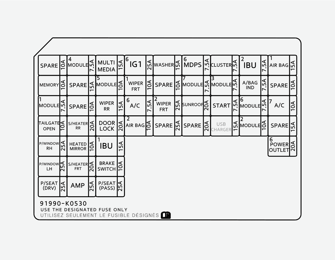 Luz ambiental de sonido, caja de conexiones E/R (relé de la toma de corriente), audio, cargador USB delantero/trasero, cargador inalámbrico, AMP, amplificador, luz de alcance ambiental de la puerta del conductor/pasajero, interruptor del espejo exterior eléctrico, unidad principal de navegación y A/V, IBU |