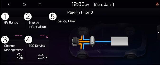 Le menu Hybride enfichable comprend cinq sections : [Autonomie EV], [Informations sur l’énergie], [Gestion de la charge], [Conduite ECO], [Flux d’énergie].
