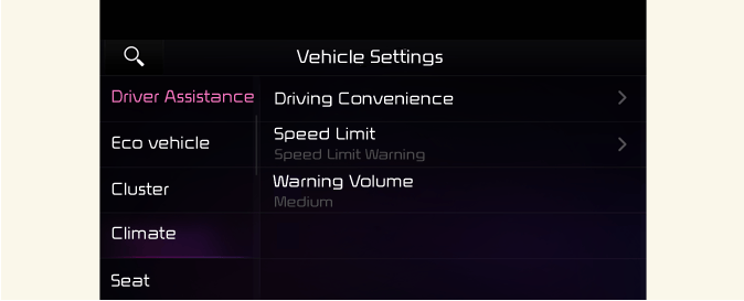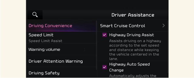 sélectionnez Configuration → Véhicule → Assistance à la conduite sur l’écran du système d’infodivertissement pour définir la fonction Assistance à la conduite.