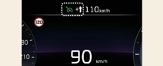 Si la limite de vitesse de la route change pendant le fonctionnement du « Manual Speed Limit Assist » (Assistance manuelle de limitation de vitesse) ou du « Smart Cruise Control » (Régulateur de vitesse intelligent), une flèche vers le haut ou vers le bas s’affichera pour informer le conducteur que la vitesse réglée doit être modifiée. À ce moment-là, le conducteur peut modifier la vitesse définie en fonction de la limite de vitesse en utilisant le bouton + ou - situé sur le volant.