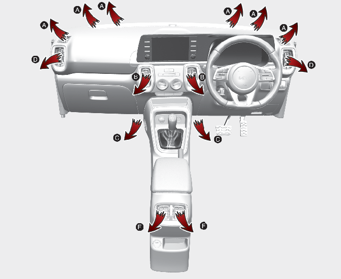 Most of the air flow is directed to the floor, with a small amount of the air being directed to the windscreen, side window defrosters and side air vents.