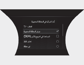 عندما يكون زر "ENGINE START/STOP (بدء تشغيل/إيقاف تشغيل المحرك)" على الوضع ON (تشغيل)، حدد أو ألغ تحديد "User Settings (إعدادات المستخدم) (من شاشة LCD) أو Settings (إعدادات)← Vehicle (السيارة) (من شاشة نظام المعلومات والترفيه) ← Driver Assistance (مساعدة السائق) ← Blind-Spot Safety (السلامة في المنطقة المحجوبة)" لتحديد استخدام كل وظيفة من عدمه.