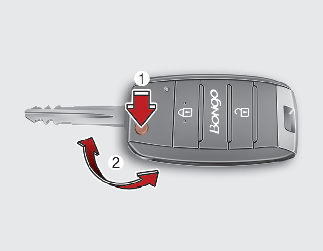 Pour déplier la clé, appuyer sur le bouton de déverrouillage (1) et la clé se déplie automatiquement.