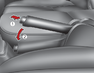 Pour appliquer le frein de stationnement, tirer la poignée du frein de stationnement complètement et fermement vers le haut tout en appliquant le frein de service.